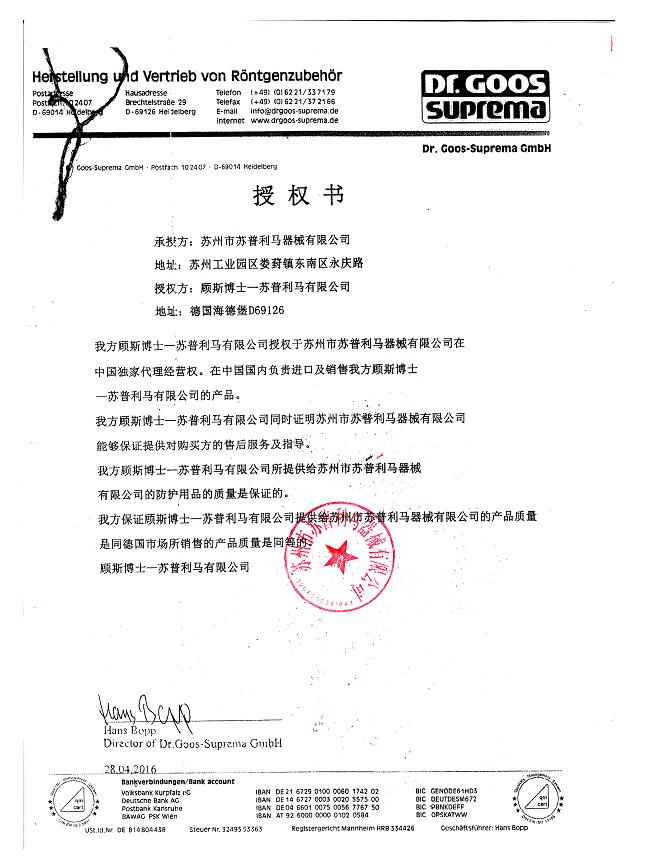 蘇州市蘇普利馬器械有限公司是專業(yè)從事醫(yī)用X射線防護(hù)系列用品、裝置、代理德國(guó)Dr.Goos-Suprema Gmbh.顧斯博士-蘇普利馬有限公司生產(chǎn)的原裝進(jìn)口鉛衣及醫(yī)用觀片燈的生產(chǎn)銷售企業(yè).生產(chǎn)的X射線防護(hù)圍裙均來自美國(guó)SHIELDING公司的最新型超薄型防護(hù)材料,,具有防護(hù)性能可靠、穿戴舒適、輕便柔軟、操作自如等諸多優(yōu)點(diǎn).產(chǎn)品均通過相關(guān)X射線檢測(cè)機(jī)構(gòu)的檢測(cè),達(dá)到產(chǎn)品標(biāo)準(zhǔn)的要求.X射線醫(yī)用膠片觀察燈。是采用全LFD燈光技術(shù)。具有重量輕,光源均勻,亮度高,無頻閃,不變型,使用壽命長(zhǎng)等特點(diǎn)。均取得了生產(chǎn)許可及醫(yī)查看更多>>